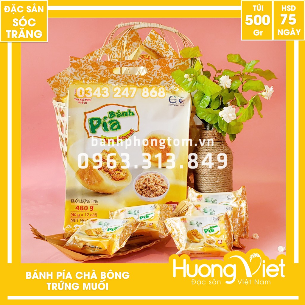 Bánh pía chà bông trứng muối là sản phẩm mới nhất của Tân Huê Viên với thành phần chính của bánh được làm từ bột mì, đậu xanh, trứng muối, chà bông và bột năng
