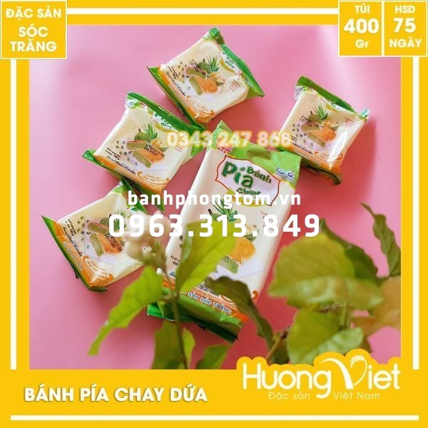 Bánh pía chay dứa trọng lượng 400g bao gồm 4 bánh bên trong có bao bì riêng biệt từng cái với thành phần chính đậu xanh, lá dứa và sầu riêng