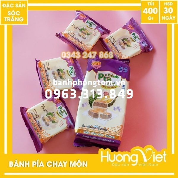 Bánh pía chay môn trọng lượng 400g bao gồm 4 bánh bên trong có bao bì riêng biệt từng cái với thành phần chính khoai môn và sầu riêng