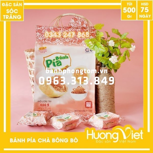 Bánh pía chà bông bò là sản phẩm mới nhất của Tân Huê Viên với thành phần chính của bánh được làm từ chà bông bò, lạp xưởng bò, mứt bí, nước, mè, hạt dừa, hạt bí xanh, hạt hạnh nhân, mứt gừng tạo nên hương vị bánh độc đáo và ăn rất ngon