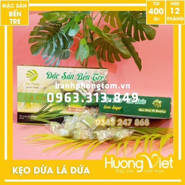 Kẹo dừa lá dứa cao cấp Du Thảo 400g (khồng có sầu riêng) với thành phần chính của kẹo là nước cốt dừa, lá dứa và không có sầu riêng mang đến hương vị truyền thống của kẹo dừa xứ Bến Tre
