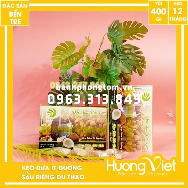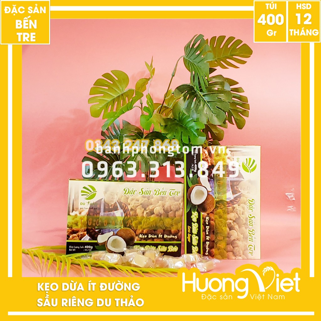 Kẹo dừa sữa béo cao cấp Du Thảo 400g (khồng có sầu riêng) với thành phần chính của kẹo là nước cốt dừa, sữa béo và không có sầu riêng mang đến hương vị truyền thống của kẹo dừa xứ Bến Tre
